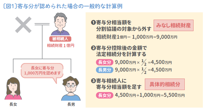 〔図1〕をご覧ください。相続財産が1億円ある中で、上記の理由により1000万円の寄与分が認められると、その寄与分1000万円が一時的に分割協議の対象から外れ、寄与をした相続人がもらう相続財産に合算されます。
