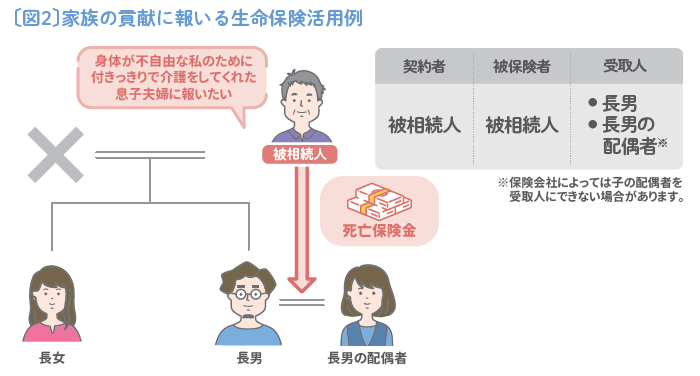 それでは、長年尽くしてくれた子供たちに、きちんと報いるにはどうしたらよいのでしょうか。1つの方法は「遺言で具体的に記載しておく」ことです。「長女は母の介護に尽くしてくれたので、遺産のうち自宅を相続させる」と記載すれば、寄与分の議論を避けられます。しかし、遺言も相続人が複数いれば遺留分侵害の問題が生じ、思った通りに渡せない可能性もあります。ここで生命保険です〔図2〕