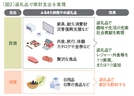 そこに使えるのが、ふるさと納税で貰える返礼品。もともと予定・計画していた支出を、返礼品で賄うという発想です〔図2〕。