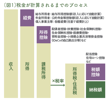 例えば、自己負担のiDeCoの拠出金や生命保険料等に係る「所得控除額」は個々で異なります。また、算出税額から差し引ける「税額控除」があれば、最終的な納税額は概算より少なくなります〔図1〕