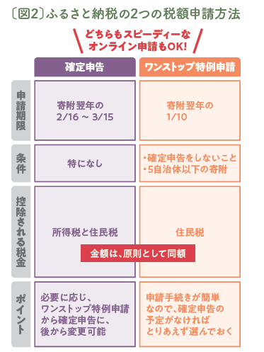 ふるさと納税で、税額の還付・控除を受けるためには、その申請を行う必要があります。その方法は2つ〔図2〕